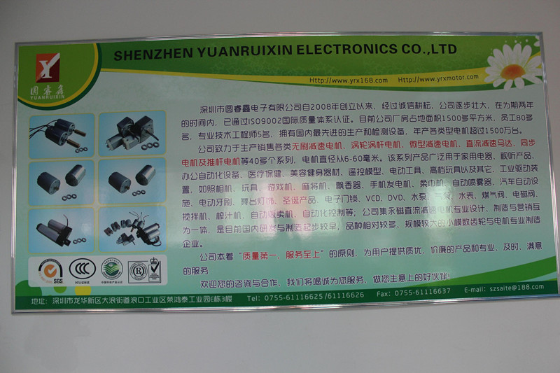 深圳市圓睿鑫電子有限公司自2008年創(chuàng)立以來,經(jīng)過誠信耕耘,在為期兩年的時間內(nèi),已通過ISO9001:2000國際質(zhì)量體系認(rèn)證。公司廠房占地面積2000多平方米,員工100人,專業(yè)技術(shù)工程師6名,擁有國內(nèi)最先進(jìn)的生產(chǎn)和檢測設(shè)備,年產(chǎn)各類減速電機(jī)超過2~300萬臺。因公司發(fā)展需要,于2020年底,將生產(chǎn)基地遷往擁有最美小鎮(zhèn)之稱的東莞市清溪鎮(zhèn),依山傍水,依托美麗的大自然環(huán)境和地方文化,全新的東莞市圓睿鑫電子有限公司將借助深圳母公司平臺,一步步走上新的臺階。 東莞公司將繼續(xù)致力于生產(chǎn)銷售各類無刷減速電機(jī) 渦輪渦桿電機(jī),微型減速電機(jī),直流減速馬達(dá),交流手搖發(fā)電機(jī)、同步電機(jī)及空心杯電機(jī)等,電機(jī)直徑從6-60毫米為定位,系列產(chǎn)品廣泛用于智能家電、智能辦公自動化設(shè)備、智能醫(yī)療、美容健身器材、遙控模型、電動工具、高檔玩具以及其它工業(yè)驅(qū)動裝置,如高檔玩具、游戲機(jī)、麻將機(jī)、飄香器、手機(jī)發(fā)電機(jī)、柔巾機(jī)、自動噴霧器、汽車自動設(shè)施、電動牙刷、舞臺燈飾、圣誕產(chǎn)品、智能電子門鎖、VCD、DVD、水泵、氣泵、水表、煤氣閥、電磁閥、攪拌機(jī)、榨汁...